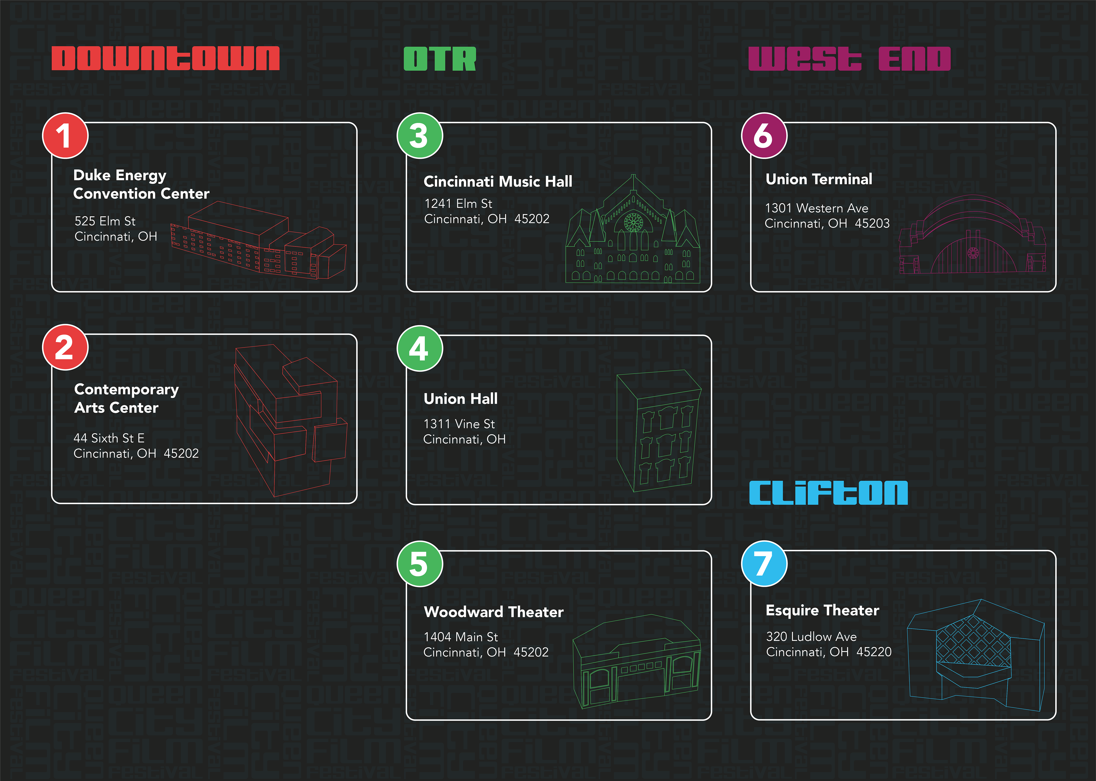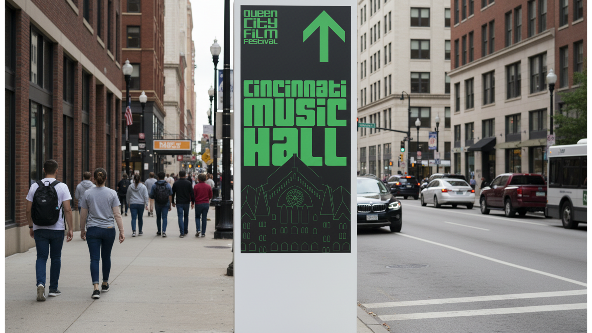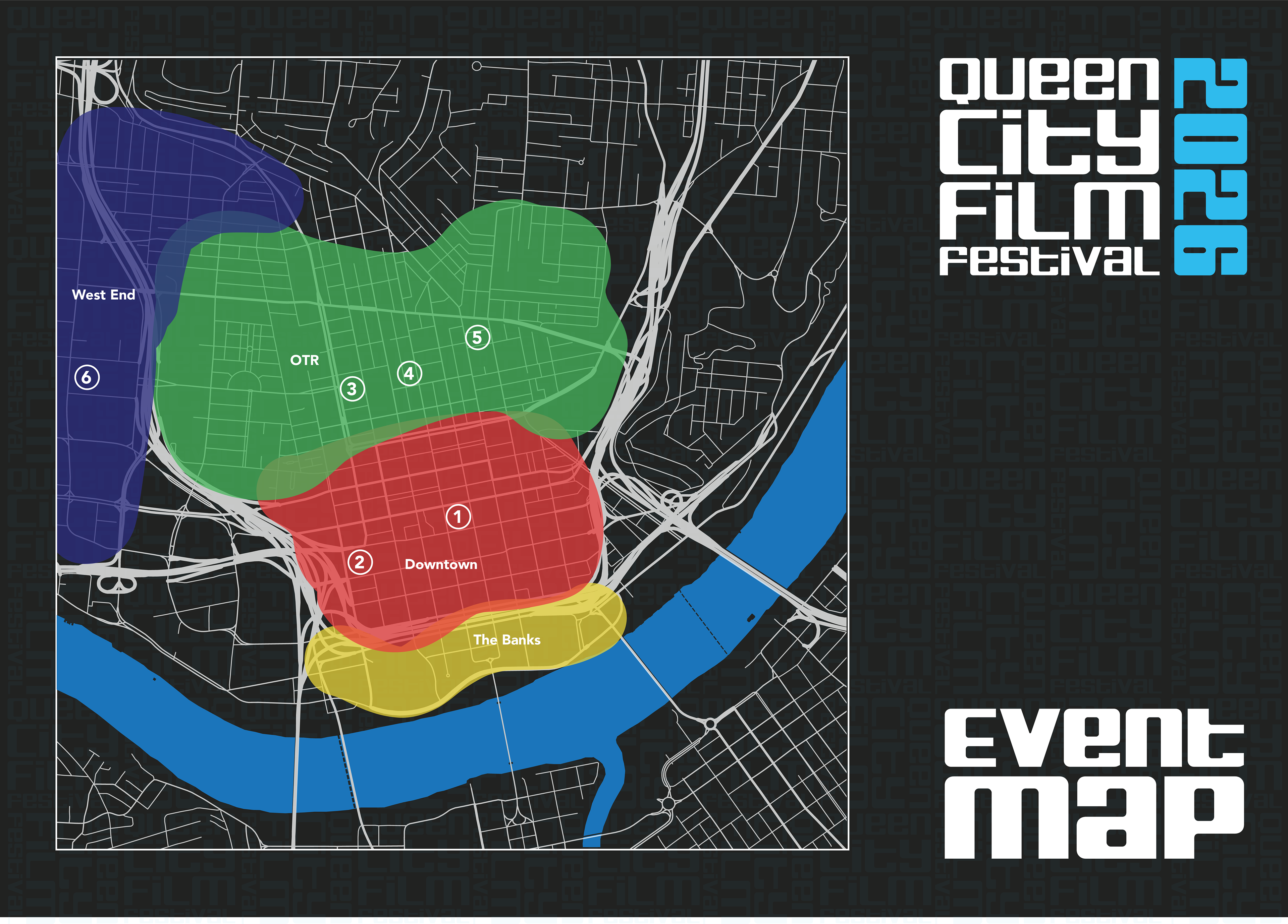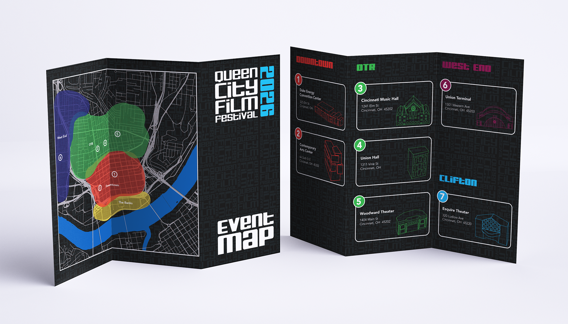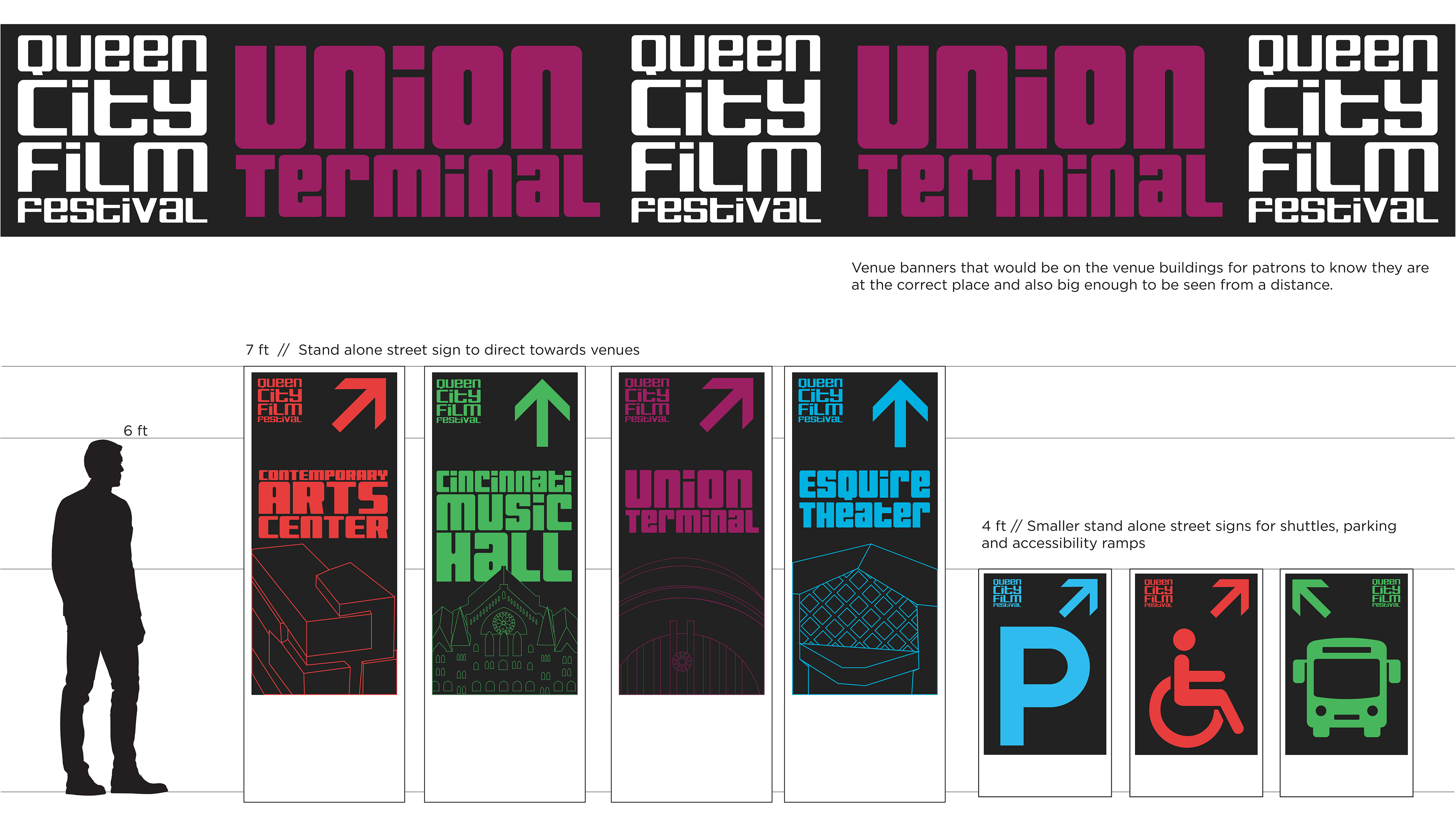 For the Queen City Film Festival, I designed a navigational system that balances clarity with character, guiding visitors through venues, screenings, and events across Cincinnati. The project focused on legibility, hierarchy, and intuitive flow while reflecting the festival’s creative energy and local identity. By translating complex schedules and locations into a cohesive way-finding language, the system helps audiences move seamlessly between films and the city, letting the experience stay focused on cinema, not confusion.